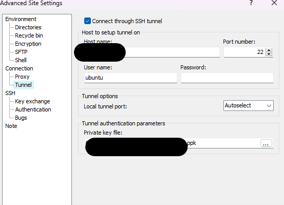 Setting Value Host name Enter the private IPv4 address of your WordPress server. Port number 22User name ubuntuAuthentication Select your key.ppkkey file for the SSH private key.Set Up the Tunnel