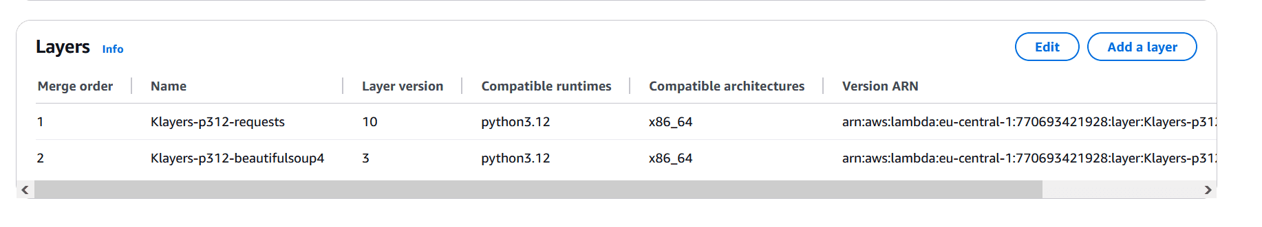 Add the following layers for requests and BeautifulSoup. Use the appropriate Python runtime version and region-specific ARNs from the Klayers repository.