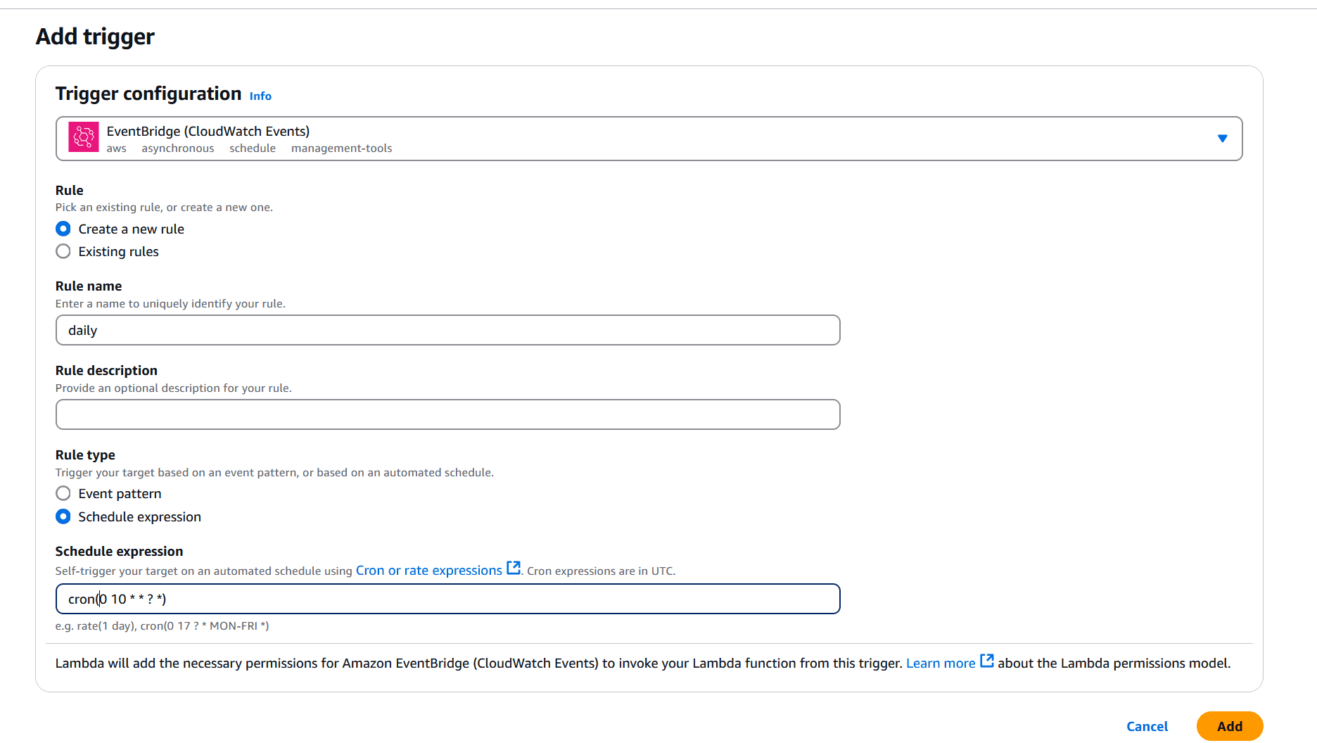 Configure an EventBridge Rule to trigger the Lambda periodically (daily in the example):